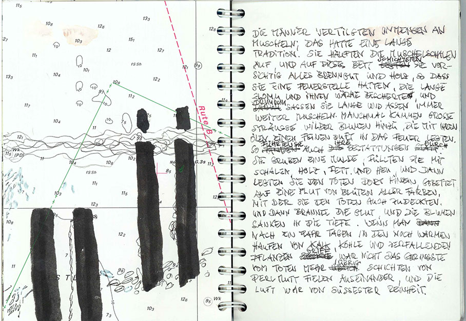 Die Männer vertilgten Unmengen an Muscheln; das hatte eine lange Tradition. Sie häuften die Muschelschalen auf, und auf dieses Bett schichteten sie vorsichtig alles Brenngut und Holz, so dass sie eine Feuerstelle hatten, die lange glomm und ihnen Wärme bescherte, und darum rum saßen sie lange und aßen immer weiter Muscheln. Manchmal kamen große Sträuße wilder Blumen hinzu, die mit ihren Ölen einen feinen Duft in das Feuer legten. So führten sie auch ihre Bestattungen durch. Sie gruben eine Mulde, füllten sie mit Schalen, Holz, Fett und Heu, und dann legten sie den Toten dort hinein, gebettet auf eine Flut von Blüten aller Farben, mit der sie den Toten zudeckten. Und dann brannte die Glut, und die Blumen sanken in die Tiefe. Wenn man nach ein paar Tagen in den noch warmen Haufen von Kalk, Kohle und zerfallenen Pflanzen griff, war nicht das Geringste vom Toten mehr übrig. Schichten von Perlmutt fielen auseinander, und die Luft war von süßester Reinheit.