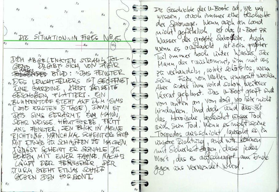 Dem abgelenkten Strahl folgend ergibt sich von Fizir dieses Bild: Das Fenster des Leuchtfeuers ist geöffnet. Eine Gardine, meist beiseite geschoben, flattert. Ein Blumentopf steht auf dem Sims (die ersten 5 Tage), dann ist das Sims geräumt. Ein Mann, sehr weiße Hautfarbe, tritt an das Fenster, den Blick in meine Richtung. Manchmal scheint er sich mit etwas zu schaffen zu machen. Jüngst scheint er Signale zu geben, mit eine Fahne. Nachts läuft der Fernseher. Der Turm steht etwas schief gegen den Horizont. > | < Die Geschichte der U-Boote ist, wie wir wissen, auch immer eine Geschichte der Spionage. Wenn auch an Land nicht gefährlich, ist das U-Boot zu Wasser der größte Saboteur. Auch wenn es auftaucht, ist sein größter Teil immer noch unter Wasser. Der Mann, der rauskommt, um mit uns zu verhandeln, wirkt schutzlos, wenn seine Füße von Wellen umspült werden. Aber unter ihm wird schon weiterer Verrat geplant. Das U-Boot greift uns von unten an, von dort, wo wir nicht hindenken. Und doch, und das ist das Heroische, bedeutet unser Tod auch seinen Tod. Wenn es nicht seine Torpedos ausschickt, lauscht es in unsere Richtung, und wir können mit Sicherheit sagen, dass jedes Wort, das es aufschnappt, am Ende gegen uns verwendet werden wird.
